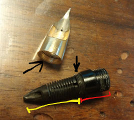 Vista del pennino, dell'alimentatore e della parte anteriore della sezione di una Snorkel Pen. Contributo di Michele (utente forum zoniale).