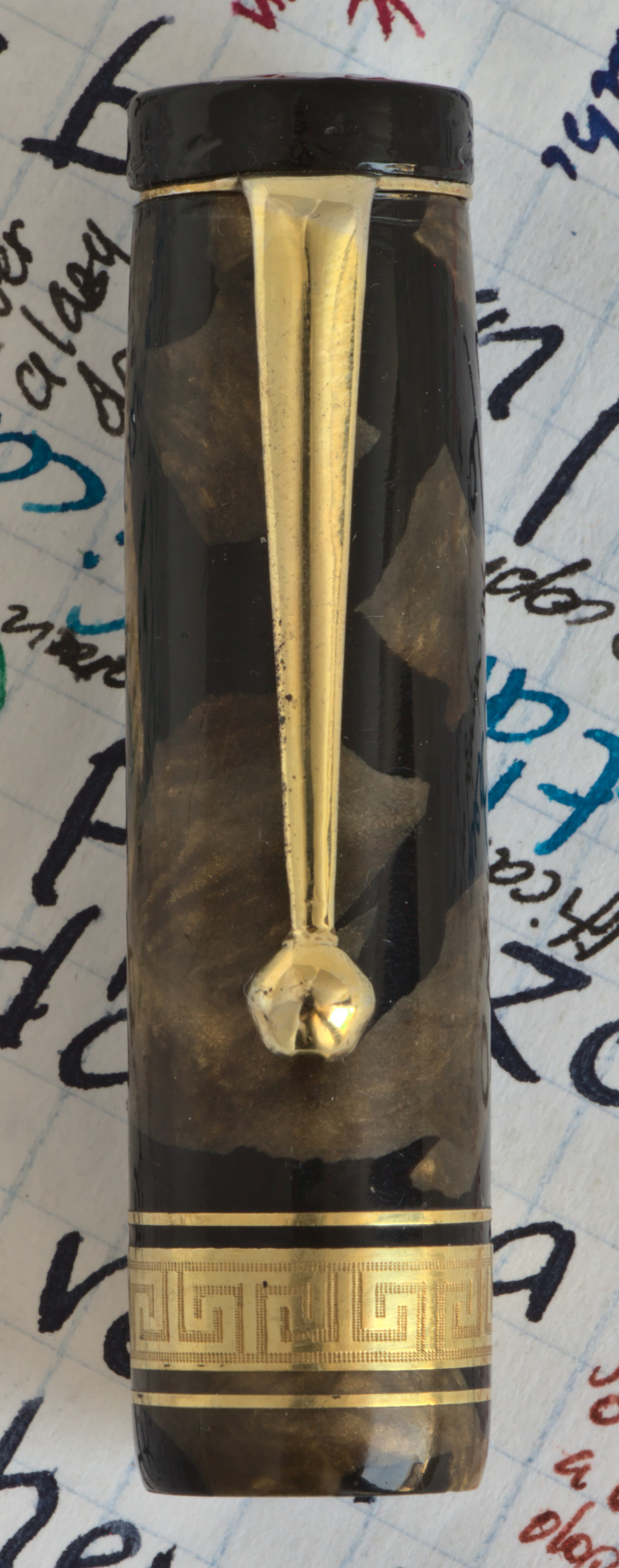 Foto di una penna Simplex. Caricamento a pulsante di fondo. Realizzazione in celluloide marmorizzata bronzo. Dettaglio del cappuccio. Modello marcato Simplex Excelsior di grandi dimensioni, in stile Duofold molto affine alle analoghe di produzione The King. Pennino Rover non originale.