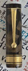 Photo of a pen produced by Simplex. Filling system: button filler. In marbled bronze celluloid. Detail of cap. Big size model in Duofold style, marked Simplex Excelsior, very similar to the analogues produced by The King. Not original Rover nib.