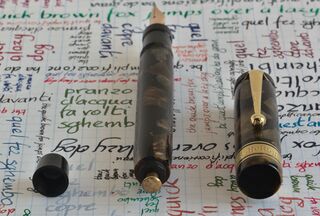 Photo of a pen produced by Simplex. Filling system: button filler. In marbled bronze celluloid. Big size model in Duofold style, marked Simplex Excelsior, very similar to the analogues produced by The King. Not original Rover nib.