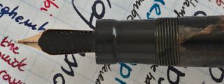 Photo of a pen produced by Simplex. Filling system: button filler. In marbled bronze celluloid. Detail of feeder. Big size model in Duofold style, marked Simplex Excelsior, very similar to the analogues produced by The King. Not original Rover nib.