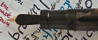 Photo of a pen produced by Simplex. Filling system: button filler. In marbled bronze celluloid. Detail of feeder. Big size model in Duofold style, marked Simplex Excelsior, very similar to the analogues produced by The King. Not original Rover nib.