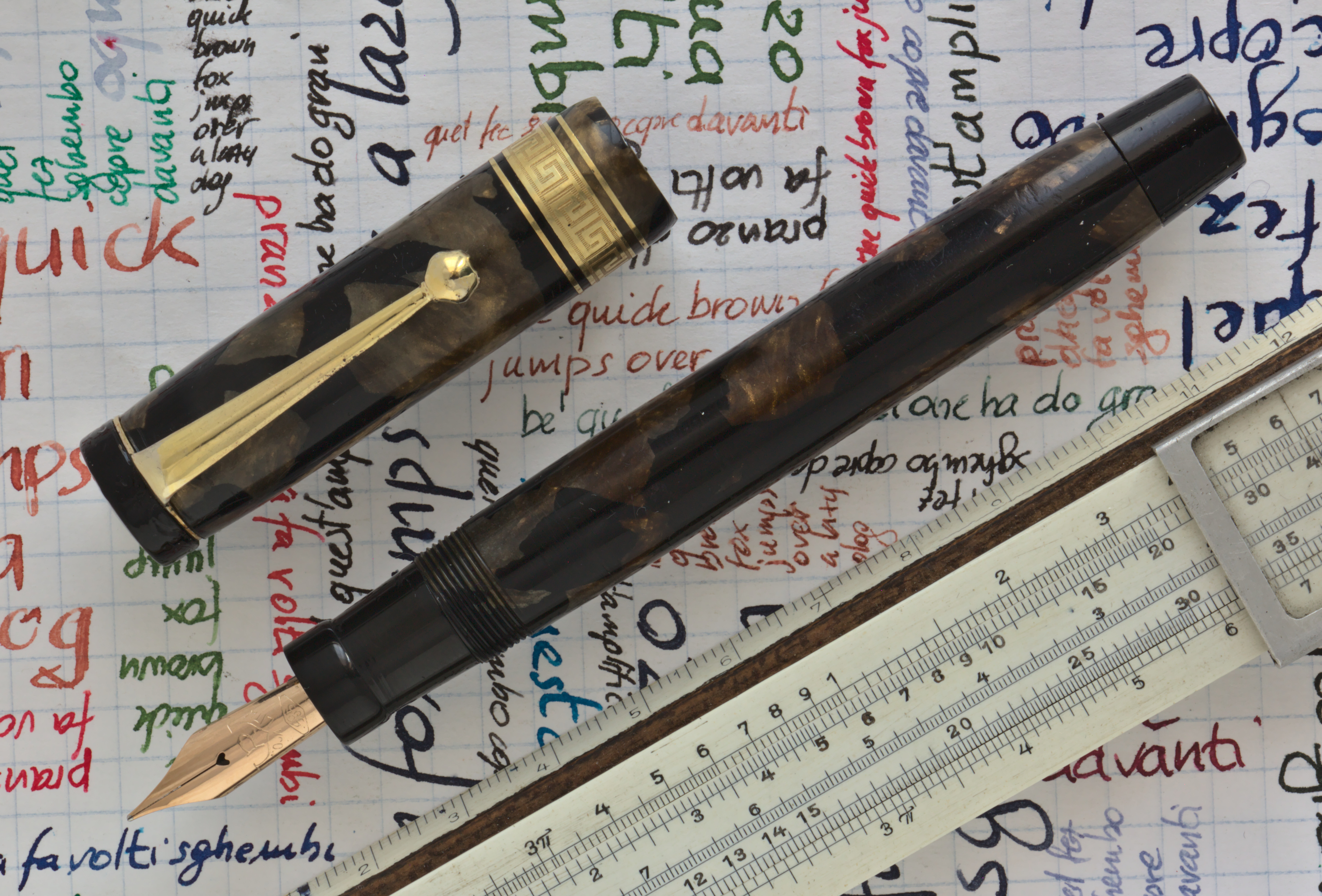 Foto di una penna Simplex. Caricamento a pulsante di fondo. Realizzazione in celluloide marmorizzata bronzo. Modello marcato Simplex Excelsior di grandi dimensioni, in stile Duofold molto affine alle analoghe di produzione The King. Pennino Rover non originale.