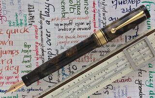 Photo of a pen produced by Simplex. Filling system: button filler. In marbled bronze celluloid. Big size model in Duofold style, marked Simplex Excelsior, very similar to the analogues produced by The King. Not original Rover nib.