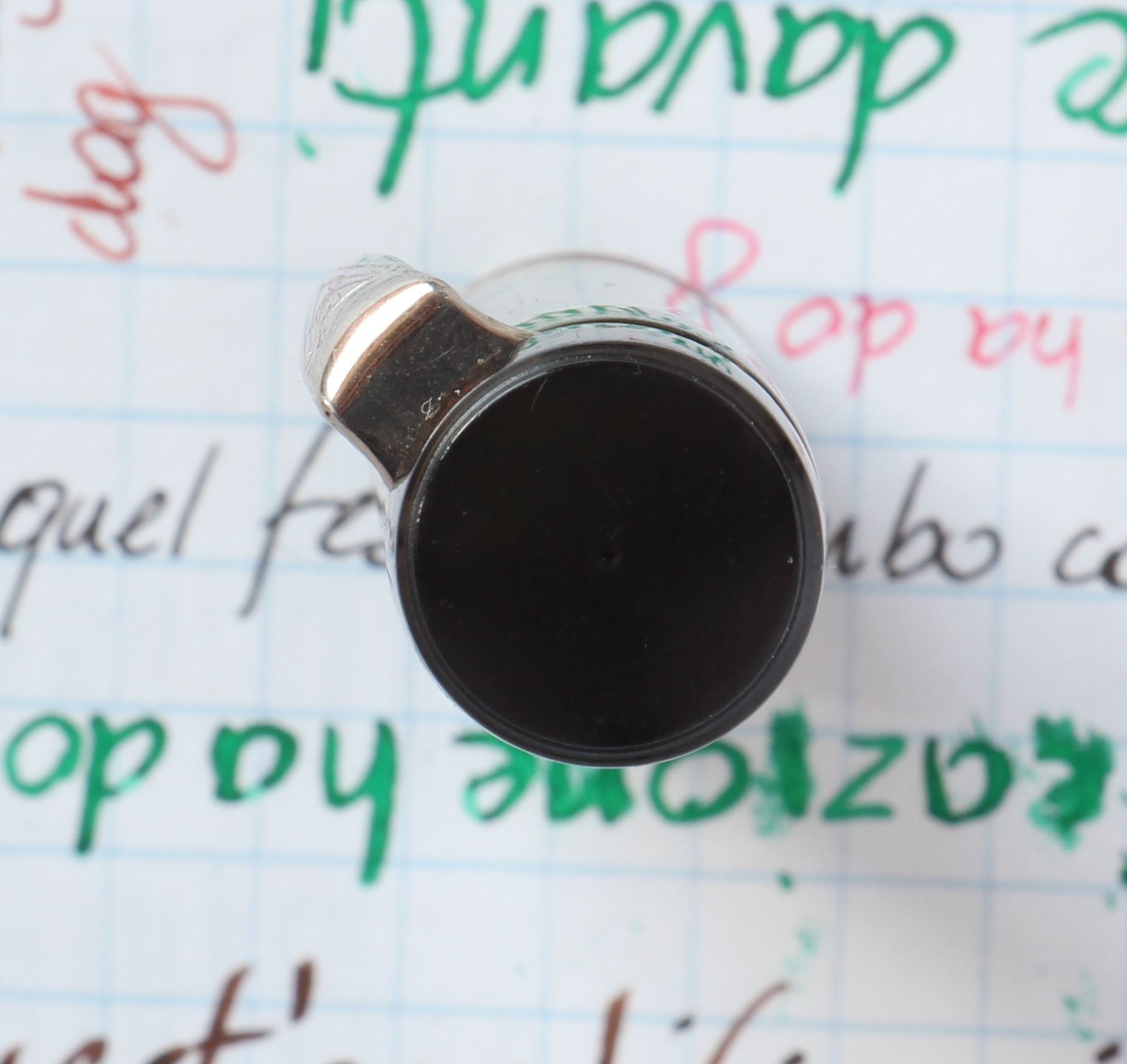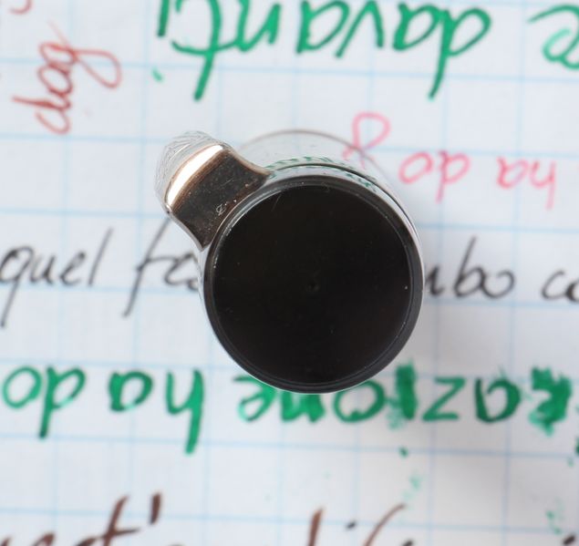Photo of a pen produced by Stiby. Filling system: button filler. In marbled gray celluloid. Detail of cap head. Unidentified model, perhaps economic production from Tabo, not original nib.