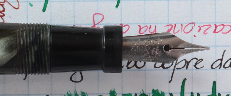 Foto di una penna Stiby. Caricamento a pulsante di fondo. Realizzazione in celluloide marmorizzata grigia. Dettaglio del pennino. Modello non identificato, forse produzione economica della Tabo, pennino non originale.