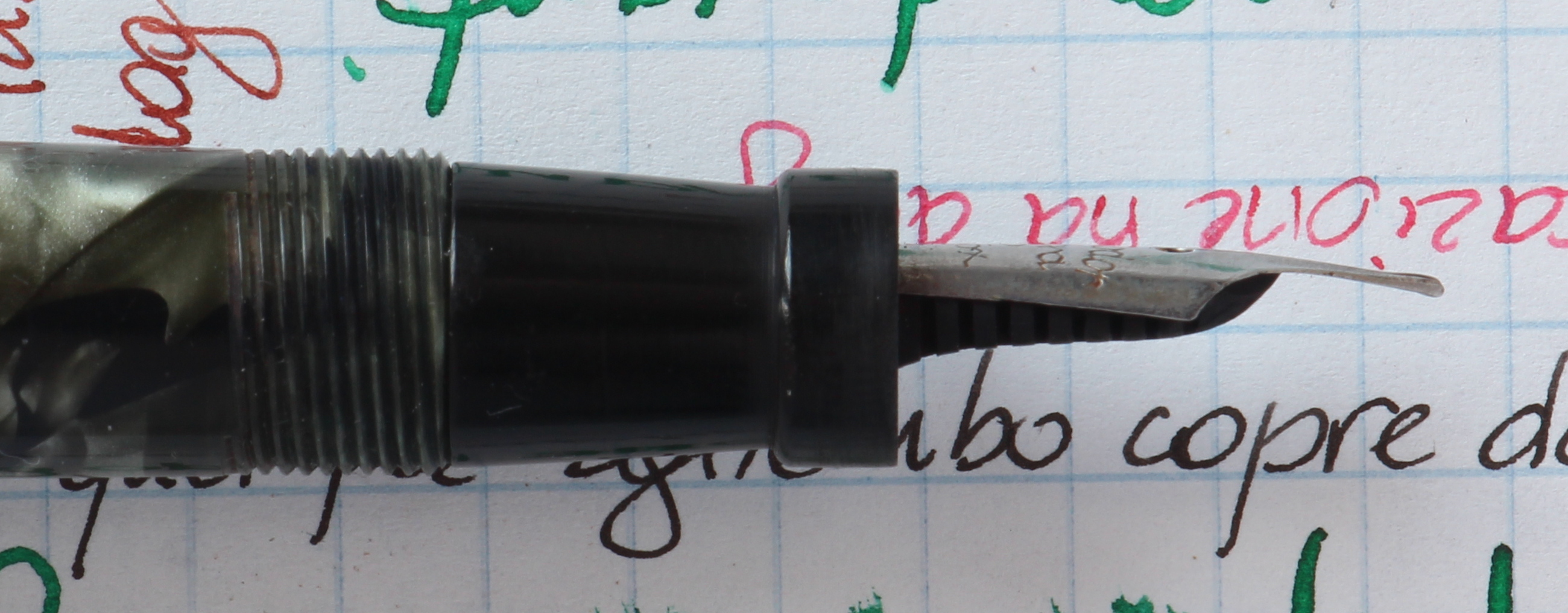 Foto di una penna Stiby. Caricamento a pulsante di fondo. Realizzazione in celluloide marmorizzata grigia. Modello non identificato, forse produzione economica della Tabo, pennino non originale.