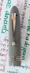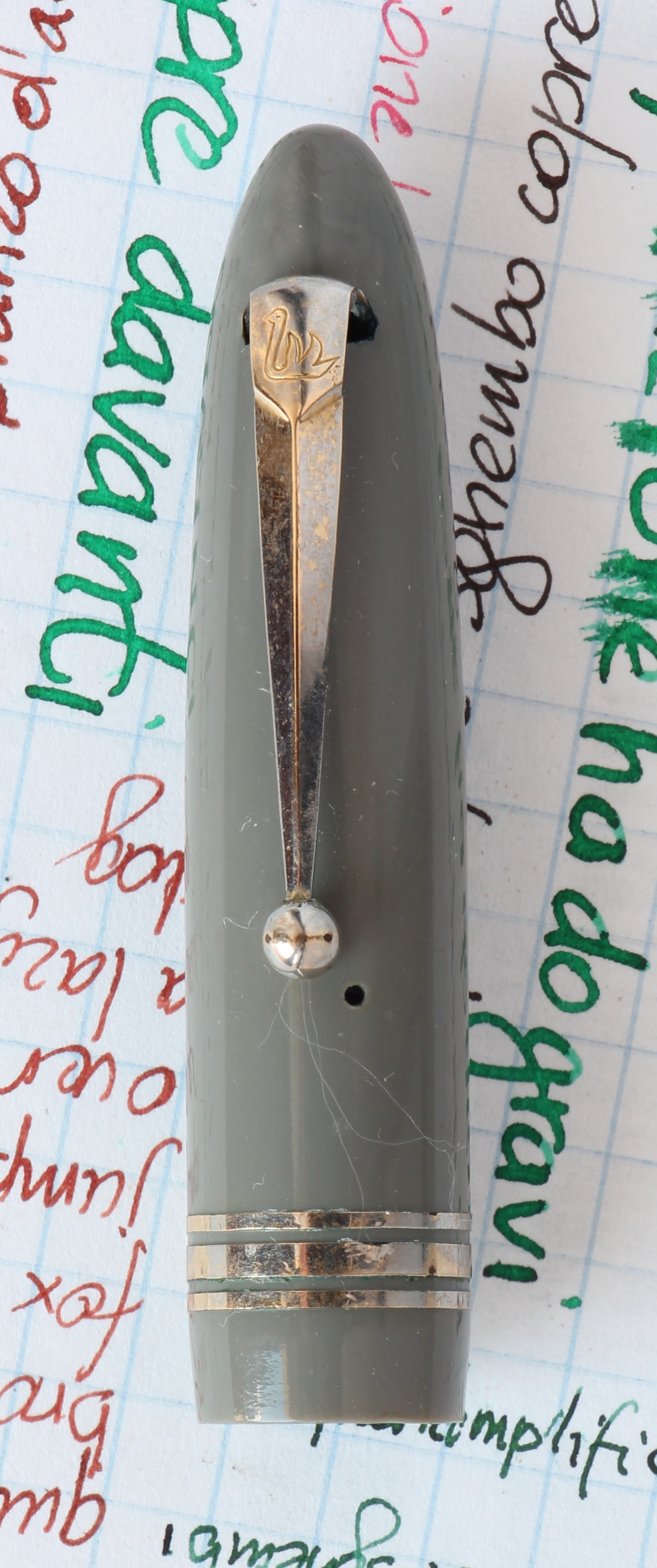 Foto di una penna Swan. Modello: Leverless 4230. Caricamento "Leverless". Realizzazione in celluloide grigia. Dettaglio del cappuccio. Modello marcato 4230, versione affusolata del dopoguerra, pennino #2.