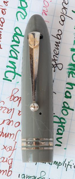 Photo of a pen produced by Swan. Model: Leverless 4230. Filling system: "Leverless". In gray celluloid. Detail of cap. Model marked 4230, post-war streamlined version, #2 nib.