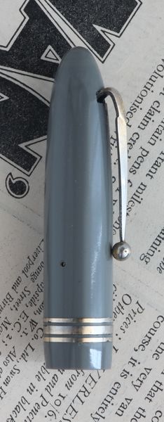 Photo of a pen produced by Swan. Model: Leverless 4230. Filling system: "Leverless". In gray celluloid. Detail of cap. Model marked 4230, post-war streamlined version, #2 nib.