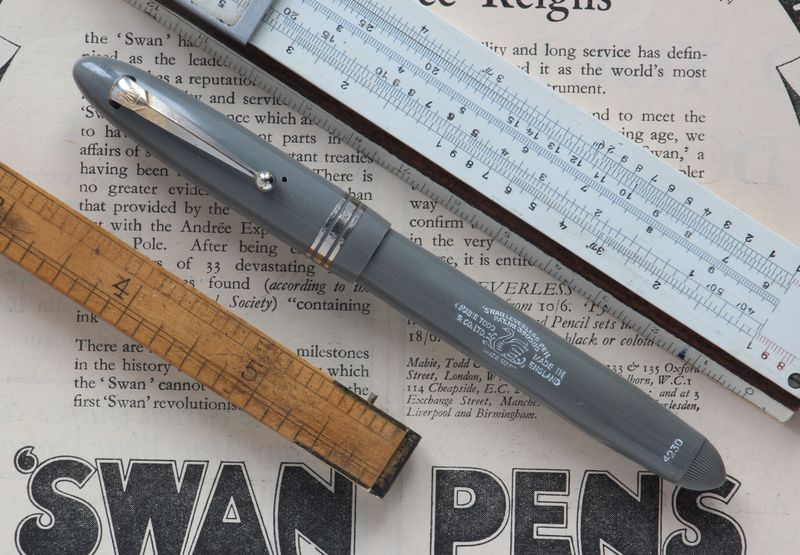 Foto di una penna Swan. Modello: Leverless 4230. Caricamento "Leverless". Realizzazione in celluloide grigia. Modello marcato 4230, versione affusolata del dopoguerra, pennino #2.