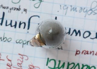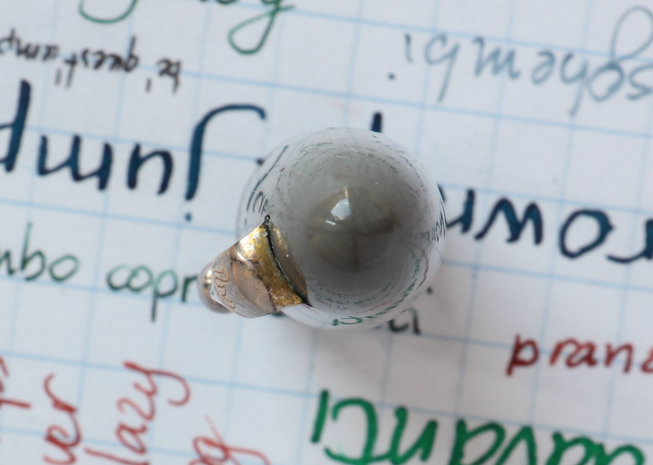 Foto di una penna Swan. Modello: Leverless 4230. Caricamento "Leverless". Realizzazione in celluloide grigia. Dettaglio della testa del cappuccio. Modello marcato 4230, versione affusolata del dopoguerra, pennino #2.