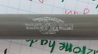 Foto di una penna Swan. Modello: Leverless 4230. Caricamento "Leverless". Realizzazione in celluloide grigia. Dettaglio della stampigliatura. Modello marcato 4230, versione affusolata del dopoguerra, pennino #2. Riporta stampigliatura del brevetto nº GB-390585.