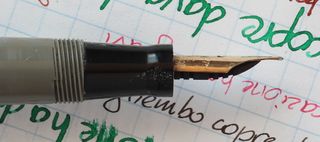 Foto di una penna Swan. Modello: Leverless 4230. Caricamento "Leverless". Realizzazione in celluloide grigia. Dettaglio dell'alimentatore. Dettaglio del pennino. Modello marcato 4230, versione affusolata del dopoguerra, pennino #2.