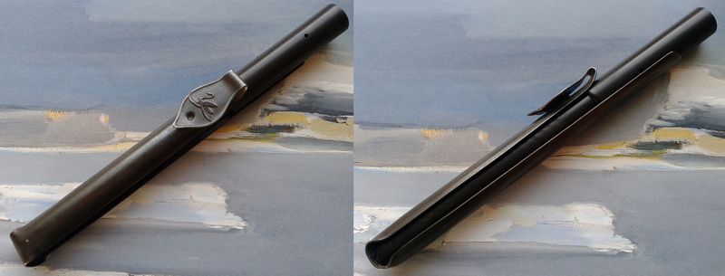 Foto di un accessorio Swan. Chiamato: Swan Metal Pocket. Realizzazione in metallo. Accessorio per traportare penne senza fermaglio, riporta il numero di brevetto (nº GB-190507113). Contributo di Giorgio (utente forum Musicus).