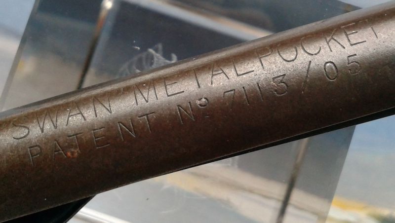 Photo of an accessory produced by Swan. Called: Swan Metal Pocket. In metal. Detail of inscription. Solution to carry pens without a clip, showing the patent number (nº GB-190507113).