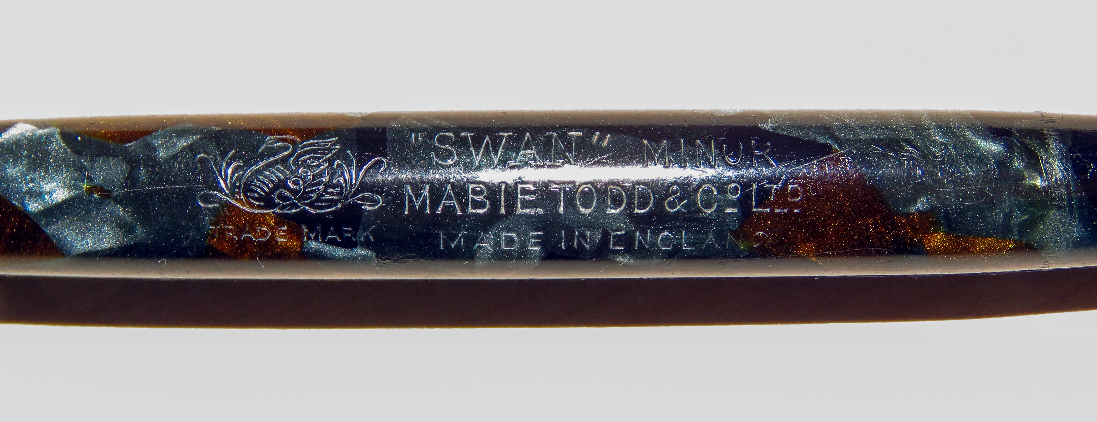 Photo of a pen produced by Swan. Model: Swan SM 1. Filling system: lever filler. In blue bronze marbled celluloid. Detail of inscription. Numbered SM1/57 (nib #1, color code 57), hard rubber lever.