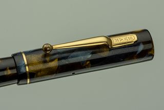 Foto di una penna Swan. Modello: Swan SM 2. Caricamento a levetta. Realizzazione in celluloide marmorizzata blu e bronzo. Dettaglio del cappuccio. Numerata SM2/57 (pennino #2, codice colore 57), levetta in ebanite. Contributo di Edo (utente forum edo68).