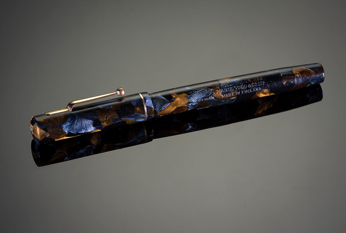 Photo of a pen produced by Swan. Model: Swan SM 2. Filling system: lever filler. In blue bronze marbled celluloid. Numbered SM2/57 (nib #2, color code 57), hard rubber lever.