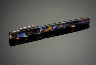 Foto di una penna Swan. Modello: Swan SM 2. Caricamento a levetta. Realizzazione in celluloide marmorizzata blu e bronzo. Numerata SM2/57 (pennino #2, codice colore 57), levetta in ebanite. Contributo di Edo (utente forum edo68).