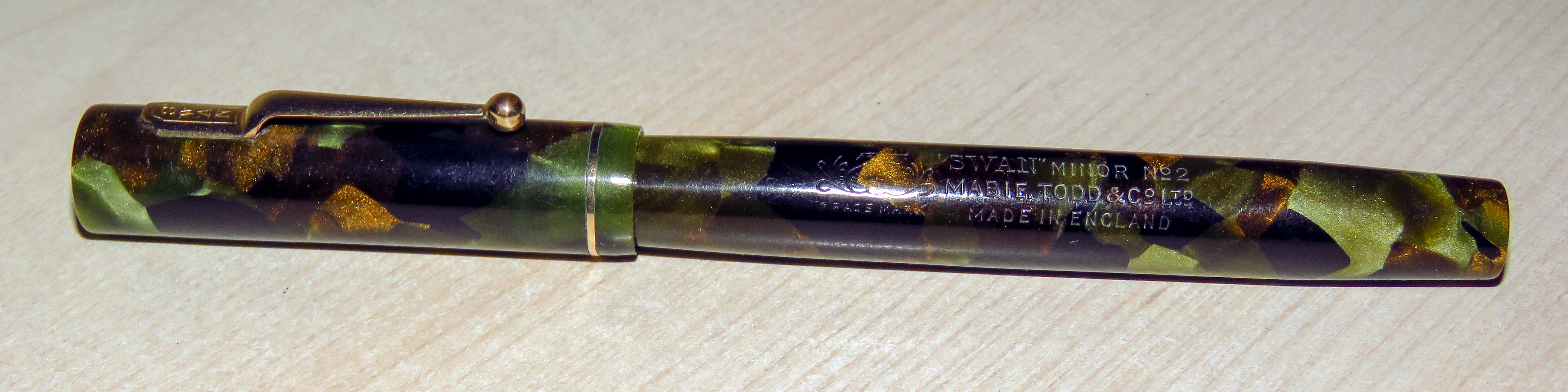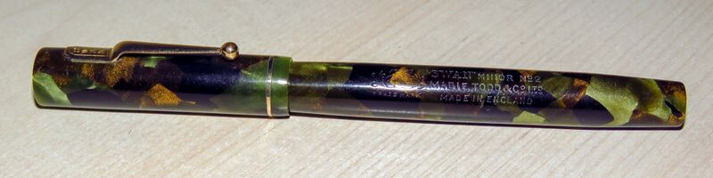 Photo of a pen produced by Swan. Model: Swan SM 2. Filling system: lever filler. In green bronze marbled celluloid. Numbered SM2/58 (nib #2, color code 58), hard rubber lever.