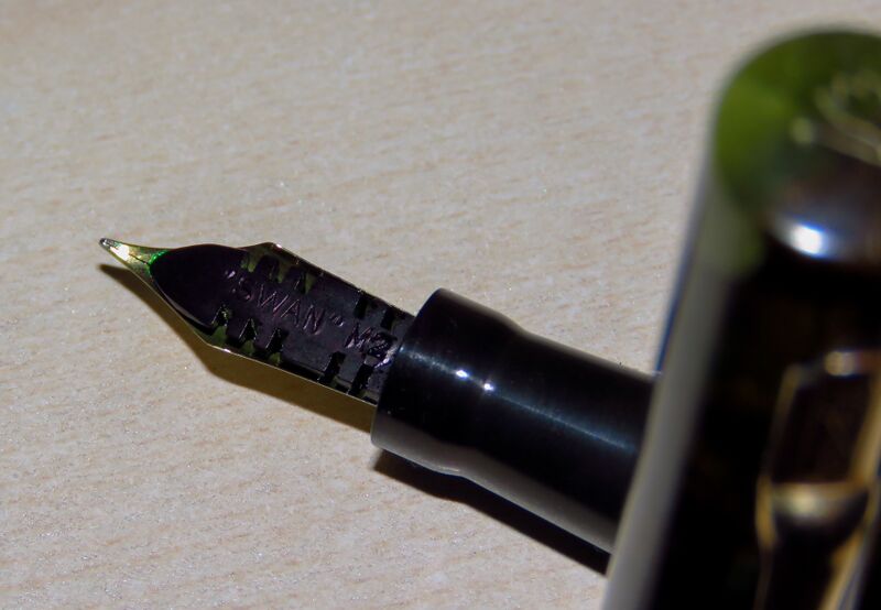 Photo of a pen produced by Swan. Model: Swan SM 2. Filling system: lever filler. In green bronze marbled celluloid. Detail of feeder. Numbered SM2/58 (nib #2, color code 58), hard rubber lever.
