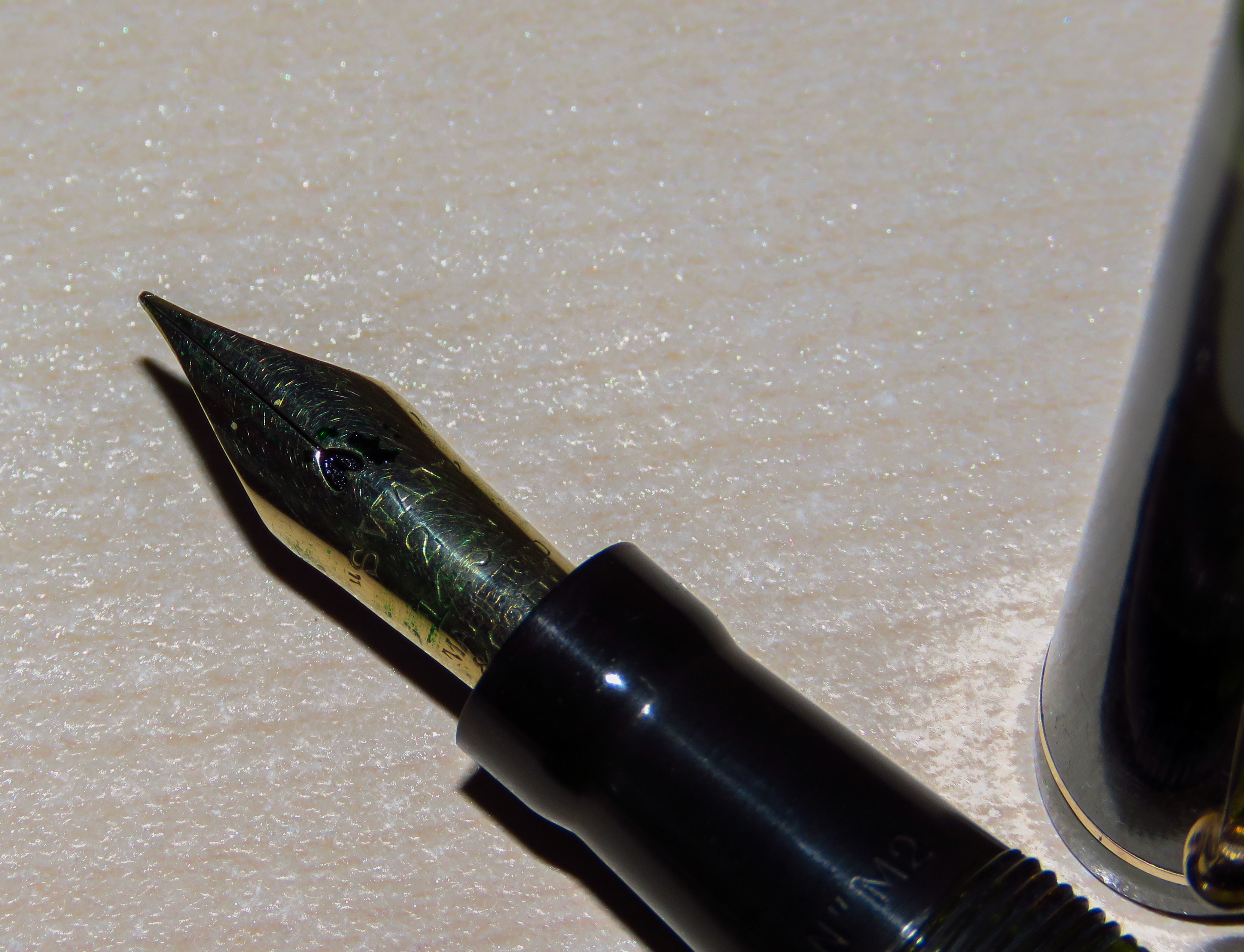 Photo of a pen produced by Swan. Model: Swan SM 2. Filling system: lever filler. In green bronze marbled celluloid. Detail of nib. Numbered SM2/58 (nib #2, color code 58), hard rubber lever.
