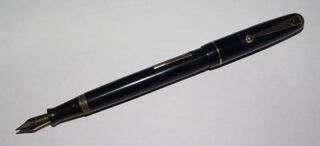 Photo of a pen produced by Swan. Model: Swan 3120. Filling system: lever filler. In dark blue celluloid. Older version with brass thread, small size with single ring, #1 nib.