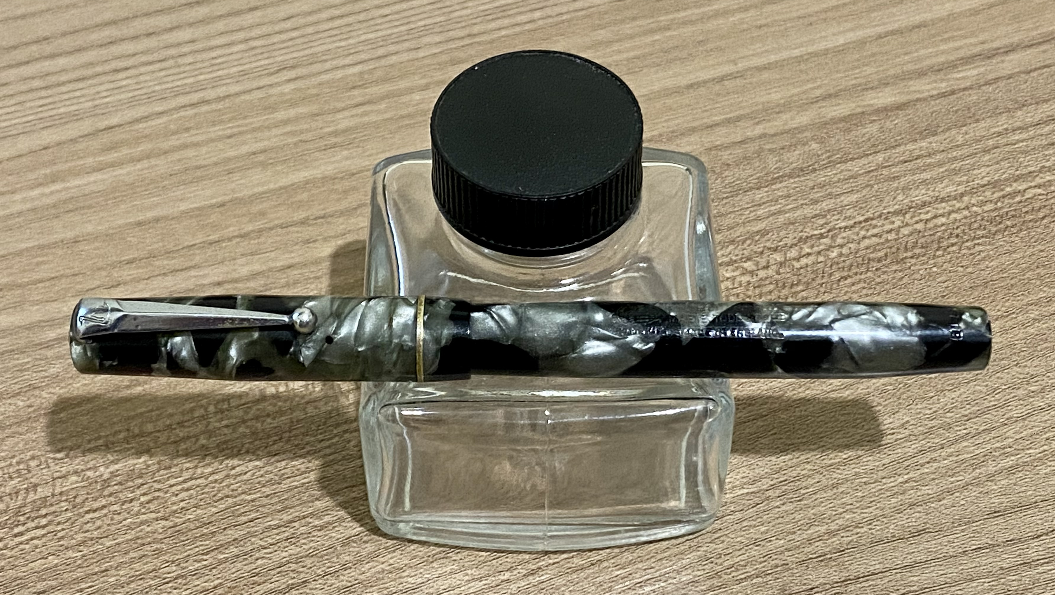 Foto di una penna Swan. Modello: Swan 6145. Caricamento a levetta. Realizzazione in celluloide marmorizzata grigia. Versione con finiture cromate.