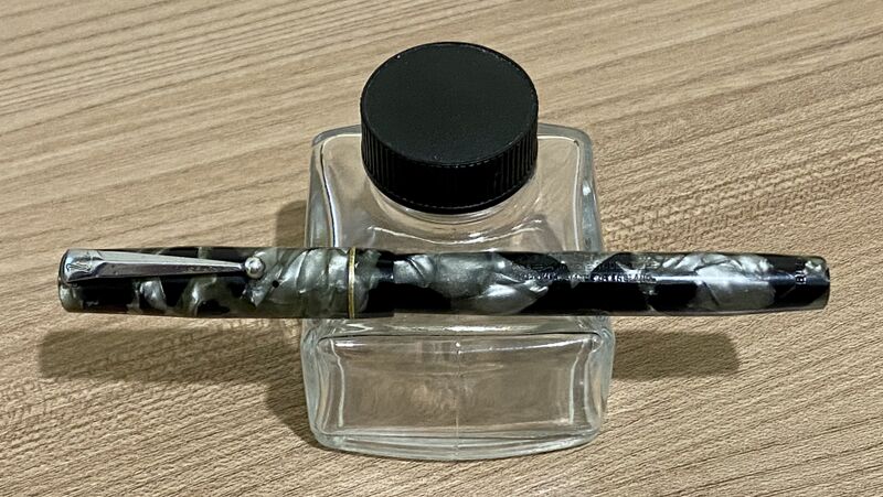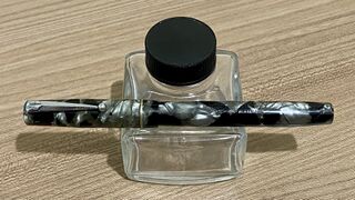 Photo of a pen produced by Swan. Model: Swan 6145. Filling system: lever filler. In marbled gray celluloid. White accents version.