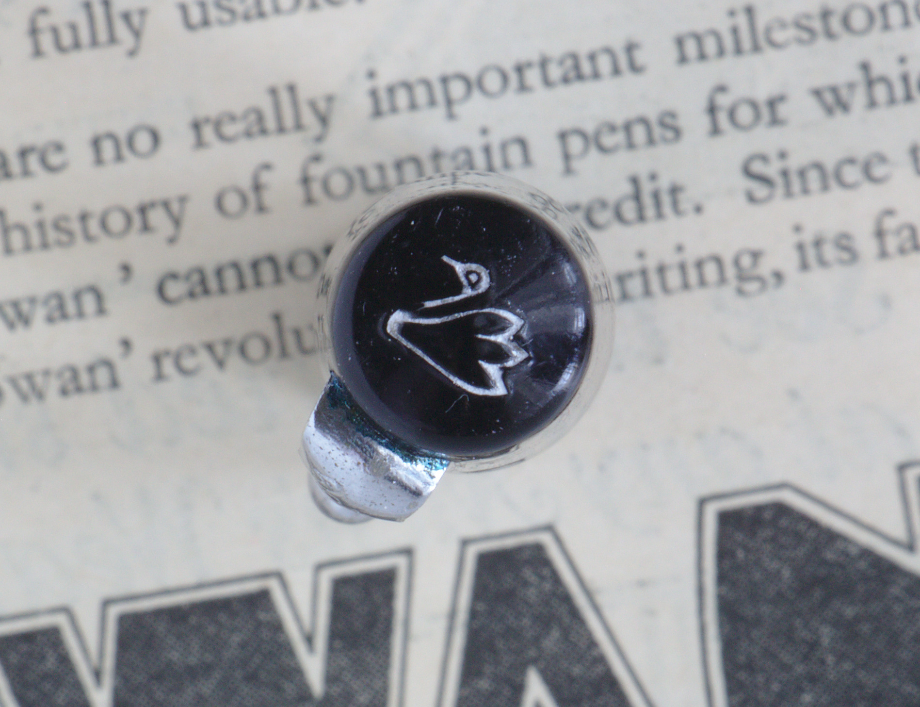Foto di una penna Swan. Modello: Swan 6160. Caricamento a levetta. Realizzazione in celluloide nera. Dettaglio della testa del cappuccio. Versione con finiture cromate.