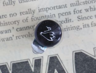 Photo of a pen produced by Swan. Model: Swan 6160. Filling system: lever filler. In black celluloid. Detail of cap head. White accents version.