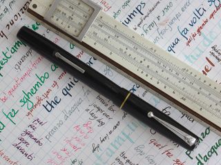 Foto di una penna Swan. Modello: Swan 6160. Caricamento a levetta. Realizzazione in celluloide nera. Versione con finiture cromate.
