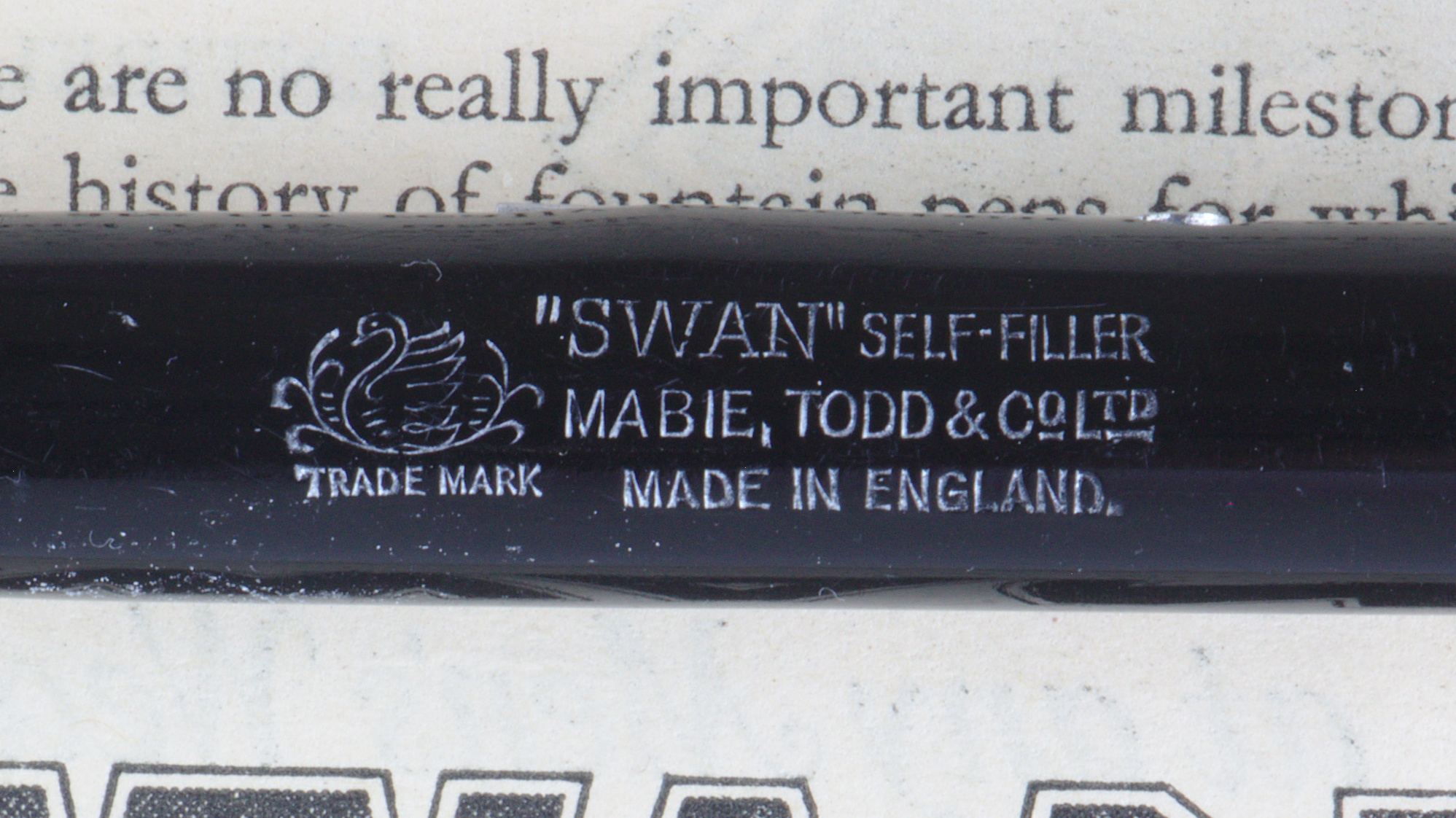 Photo of a pen produced by Swan. Model: Swan 6160. Filling system: lever filler. In black celluloid. Detail of inscription. White accents version.
