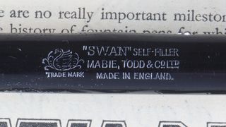 Foto di una penna Swan. Modello: Swan 6160. Caricamento a levetta. Realizzazione in celluloide nera. Dettaglio della stampigliatura. Versione con finiture cromate.