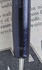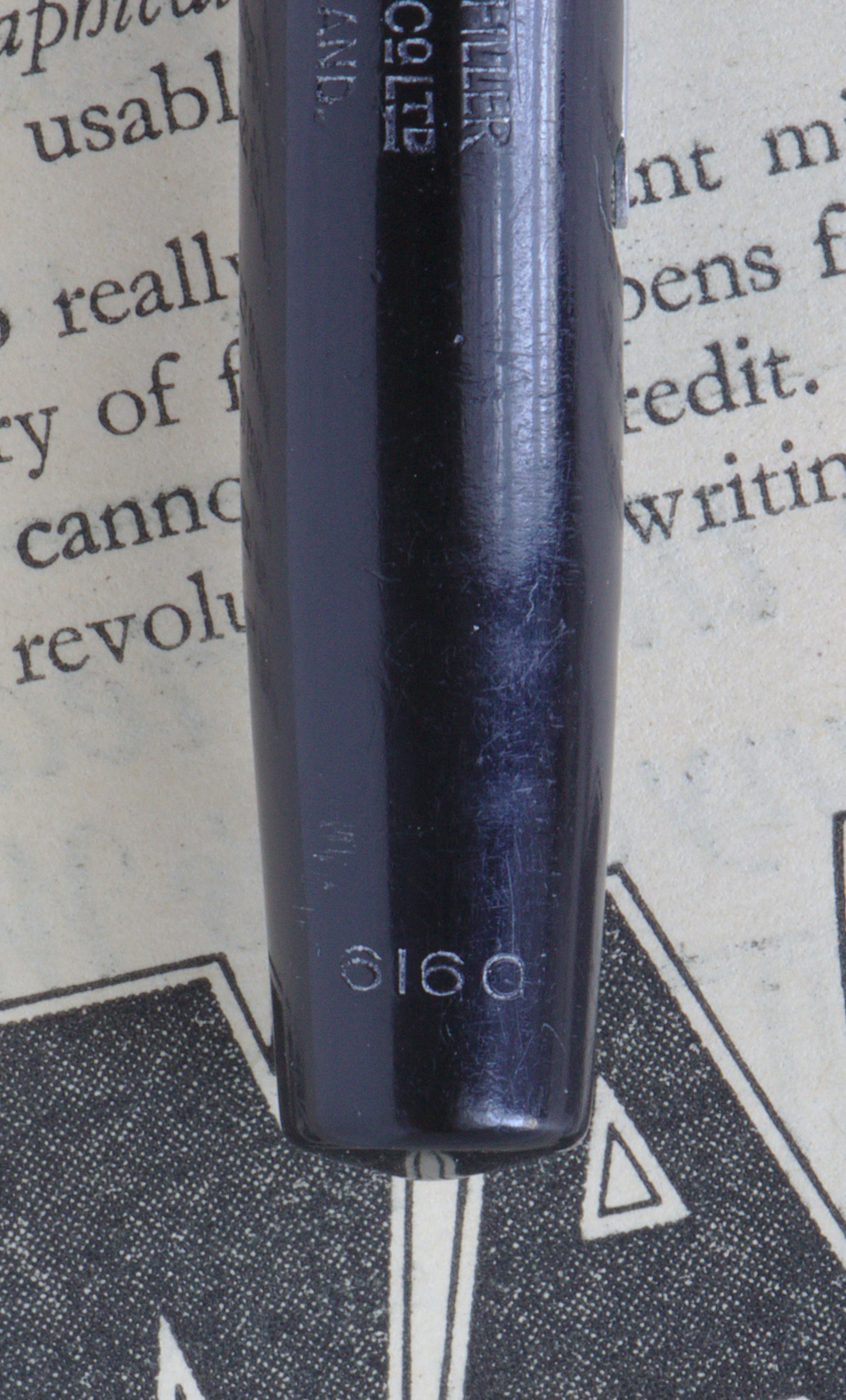 Foto di una penna Swan. Modello: Swan 6160. Caricamento a levetta. Realizzazione in celluloide nera. Dettaglio della numerazione. Versione con finiture cromate.