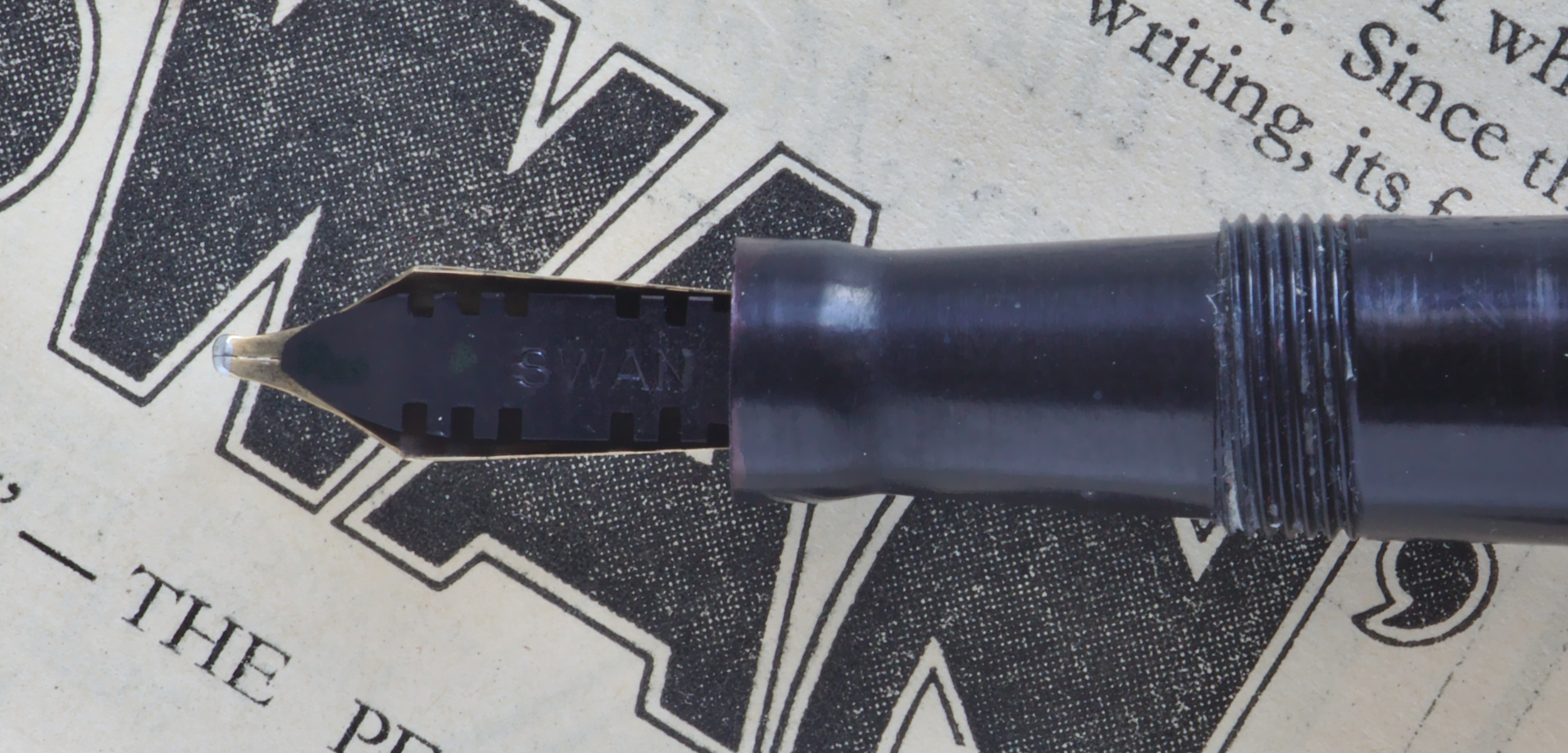 Photo of a pen produced by Swan. Model: Swan Self-Filler. Filling system: lever filler. In black celluloid. Detail of feeder. Golden accents, two cap ring version, stub nib.
