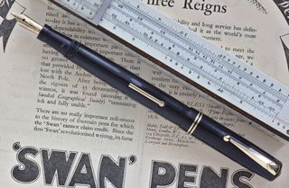 Foto di una penna Swan. Modello: Swan Self-Filler. Caricamento a levetta. Realizzazione in celluloide nera. Versione con finiture dorate e due anelli sul cappuccio, pennino stub.