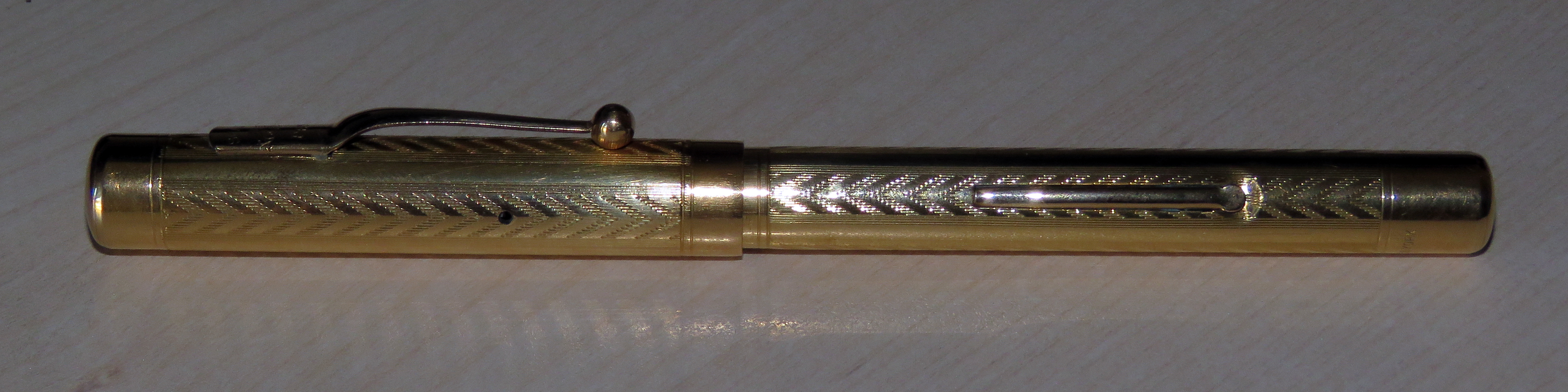 Photo of a pen produced by Swan. Model: Swan SF 2. Filling system: lever filler. In Chevron pattern gold rolled metal. Numbered SF2, English nib group, american barrel and cap.