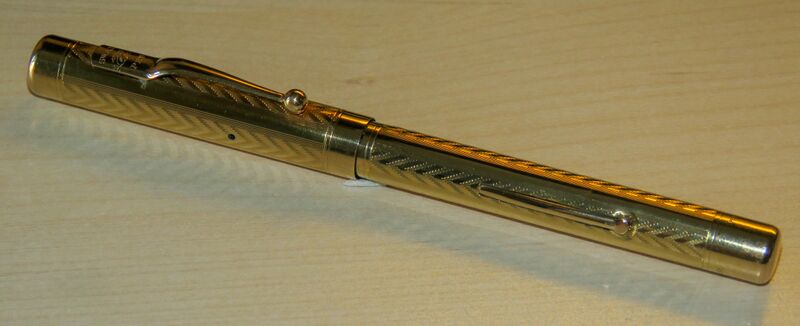 Photo of a pen produced by Swan. Model: Swan SF 2. Filling system: lever filler. In Chevron pattern gold rolled metal. Numbered SF2, English nib group, american barrel and cap.