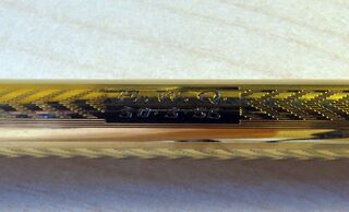Foto di una penna Swan. Modello: Swan SF 2. Caricamento a levetta. Realizzazione in metallo laminato in oro con pattern Chevron. Numerata SF2, gruppo pennino inglese, corpo penna americano. Contributo di Luca (utente forum lucawm).