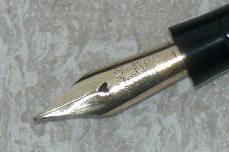 Foto di una penna Swan. Modello: Swan SF 2. Caricamento a levetta. Realizzazione in ebanite nera cesellata nera. Dettaglio del pennino. Modello senza clip, marcata Swan SF 2. Contributo di Giampaolo (utente forum.fountainpen.it gpaolo).
