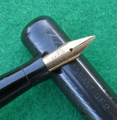 Photo of a pen produced by Swan. Model: Swan SF 2. Filling system: lever filler. In waved black chased hard rubber. Detail of nib. Clipless Swan SF 2 model, american "NY" nib but Made in England, marked Swan Self Filling Pen.