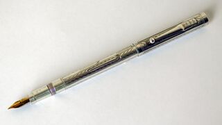 Photo of a pen produced by Swan. Model: Swan SF 2. Filling system: lever filler. In Chevron pattern gold rolled metal. Numbered SF2, american nib group, barrel and cap.