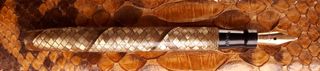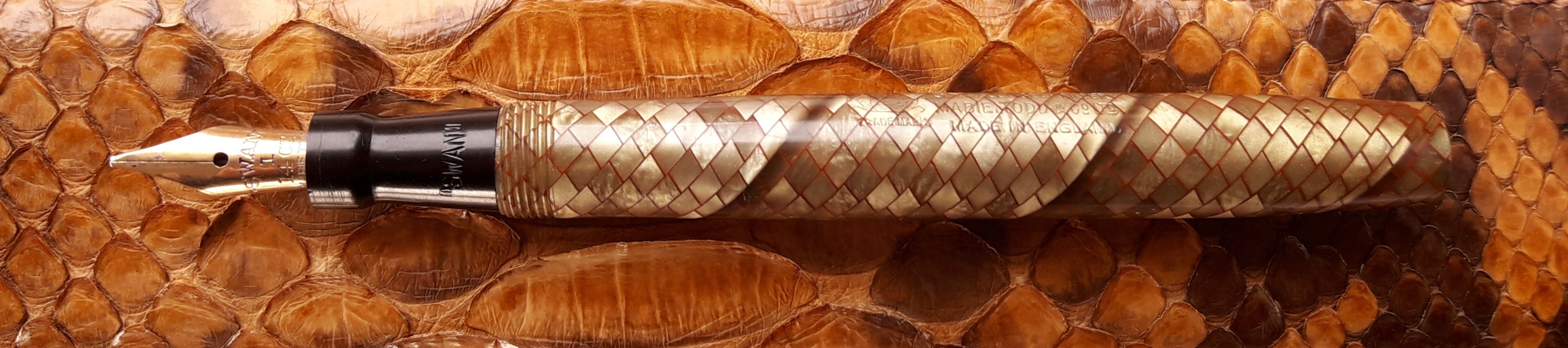 Foto di una penna Swan. Modello: Self-Filler. Caricamento a levetta. Realizzazione in celluloide a pelle di serpente grigia. Evoluzione della serie SM?. Contributo di Giorgio (utente forum Musicus).