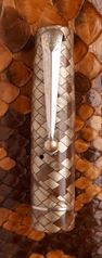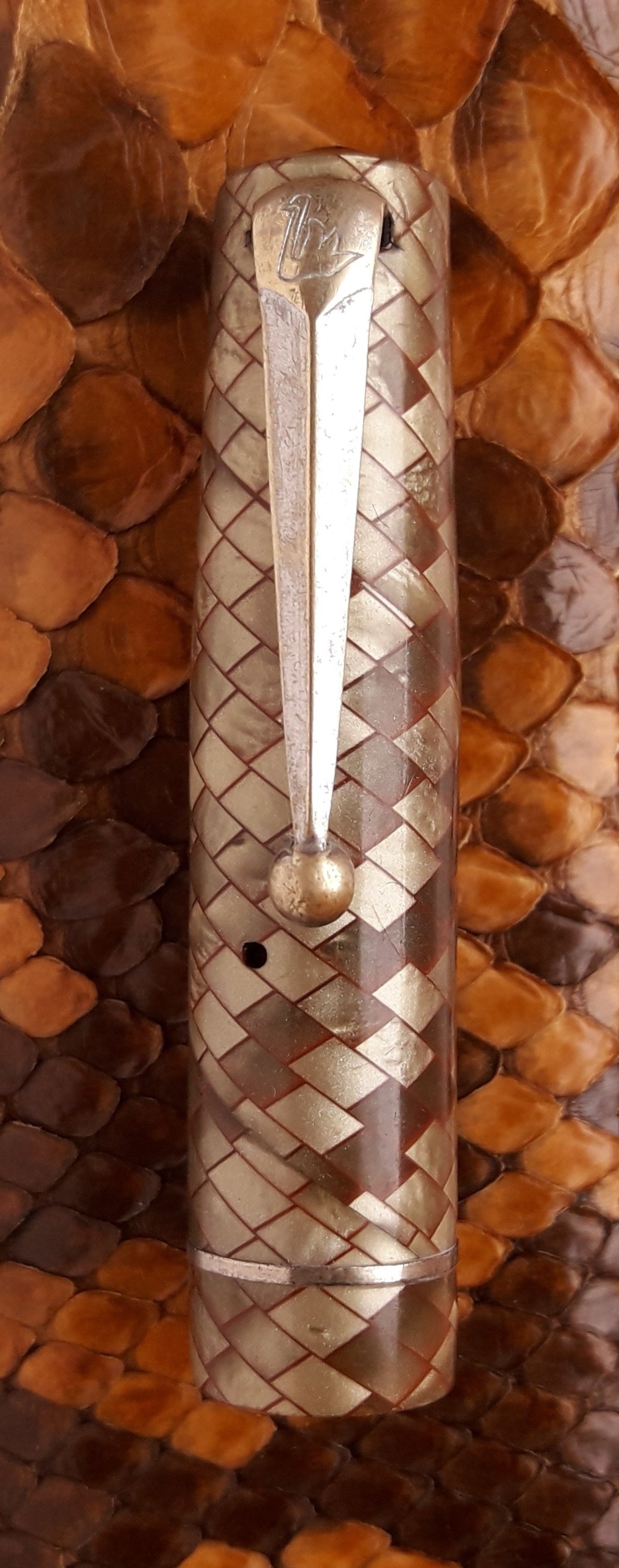 Foto di una penna Swan. Modello: Self-Filler. Caricamento a levetta. Realizzazione in celluloide a pelle di serpente grigia. Dettaglio del cappuccio. Evoluzione della serie SM?. Contributo di Giorgio (utente forum Musicus).