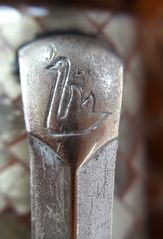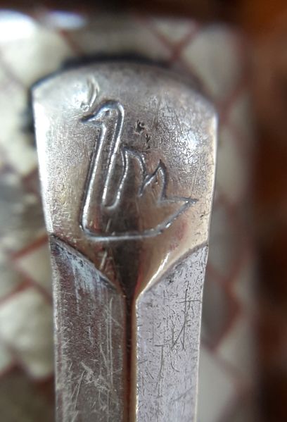 Foto di una penna Swan. Modello: Self-Filler. Caricamento a levetta. Realizzazione in celluloide a pelle di serpente grigia. Dettaglio del fermaglio. Evoluzione della serie SM?. Contributo di Giorgio (utente forum Musicus).