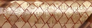 Foto di una penna Swan. Modello: Self-Filler. Caricamento a levetta. Realizzazione in celluloide a pelle di serpente grigia. Dettaglio della stampigliatura. Evoluzione della serie SM?. Contributo di Giorgio (utente forum Musicus).