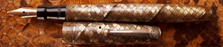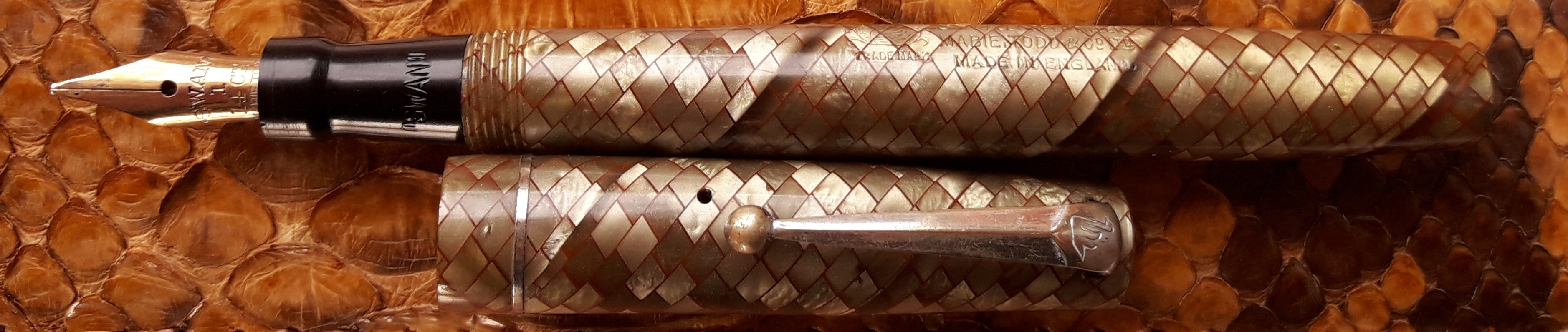Foto di una penna Swan. Modello: Self-Filler. Caricamento a levetta. Realizzazione in celluloide a pelle di serpente grigia. Evoluzione della serie SM?. Contributo di Giorgio (utente forum Musicus).