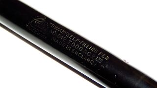 Foto di una penna Swan. Modello: Swan SF 1. Caricamento a levetta. Realizzazione in ebanite nera. Dettaglio della stampigliatura. Modello senza clip marcato Swan Self Filling Pen, con pennino "18 Ct" per il mercato francese, marcata "R.A. 1C", dove "R.A." sta probabilmente per Remplissage Automatique, come indicato in questa pubblicità dove compare la penna. Contributo di Luca (utente forum lucawm).